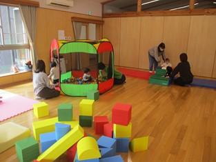 地域子育て支援センターでの普段の遊びは、1階で玩具等を出して遊びますが、月1回、2階で、1階のプレイルームにない遊具を使って思いっきり身体を動かして遊びます。